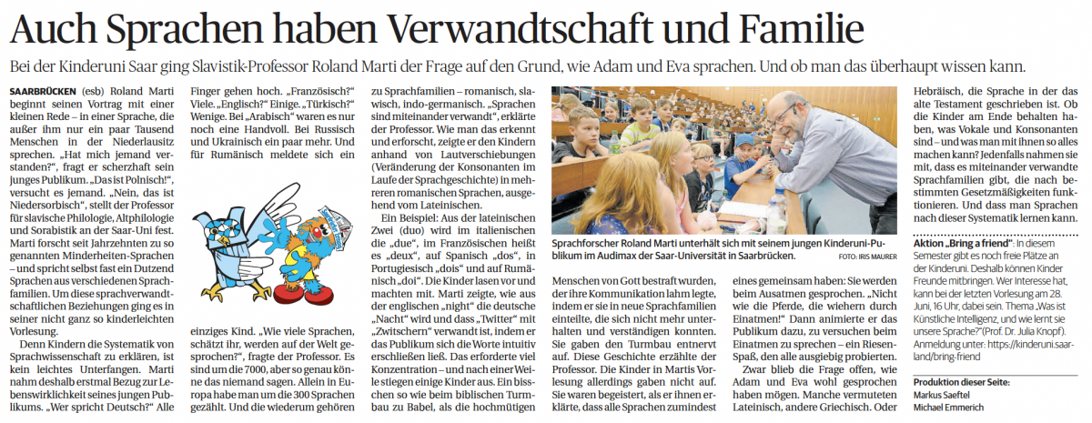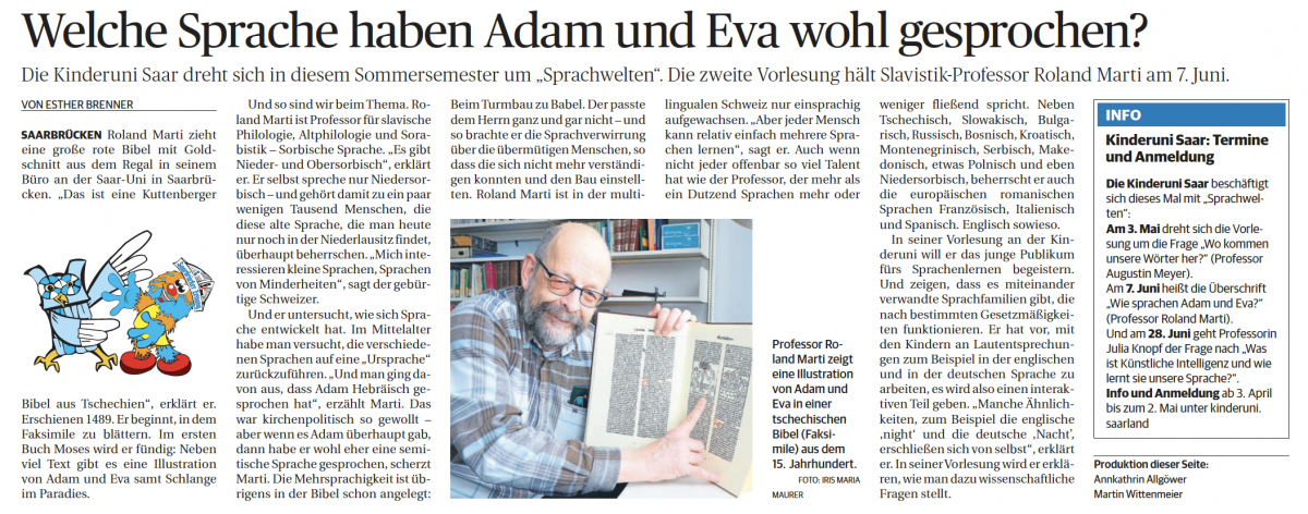 Warum gibt es eigentlich so viele Sprachen? Gab es mal eine einzige Sprache, die alle gesprochen haben und wie sprachen wohl Adam und Eva? Mit diesen und weiteren Fragen beschäftigt sich Prof. Dr. Roland Marti in der zweiten Kinderuni-Vorlesung des Sommersemesters 2023. Er erklärt uns unter anderem, warum Wissenschaftler glauben, dass Sprachen, so wie Menschen, einen Stammbaum besitzen und was eigentlich alle Sprachen gemeinsam haben. Bist du neugierig geworden? Dann klicke unten auf das Video!