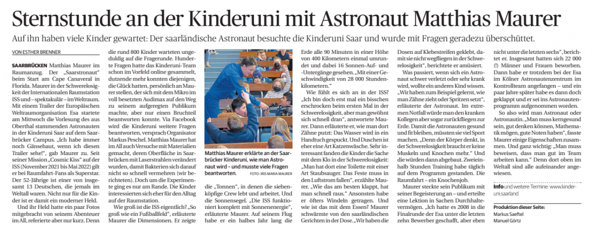 In der Weihnachtsvorlesung im Wintersemester 2022/23 zum Thema Raumfahrtwelten hat uns ein ganz besonderer Gast, nämlich Dr. Matthias Maurer, besucht. Der saarländische Astronaut reiste am 21. November 2021 als 600. Mensch ins Weltall. Auf der internationalen Raumstation ISS hat er ein halbes Jahr lang gelebt und für die Mission "Cosmic Kiss" den Weltraum erforscht. In dem Video von der Kinderuni erzählt uns der Raumfahrer von seinem besonderen Abenteuer und erklärt, wie man eigentlich Astronaut*in wird. Außerdem beantwortet er eure Kinderfragen rund ums Thema Weltall. Viel Spaß beim Zuhören, Staunen und Lernen!